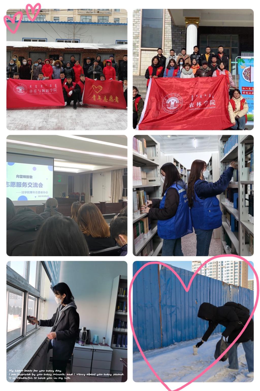 传媒学院、教育学院、音乐与舞蹈学院、数学与统计学院、文学院、美术学院、旅游与地理学院、体育学院青年志愿者开展了清理校园卫生死角活动;美术学院、生命科学学院志愿者开展了破冰除雪行动。活动中,志愿者们不怕脏不怕累,通过自己的劳动创造了干净舒适的校园环境。