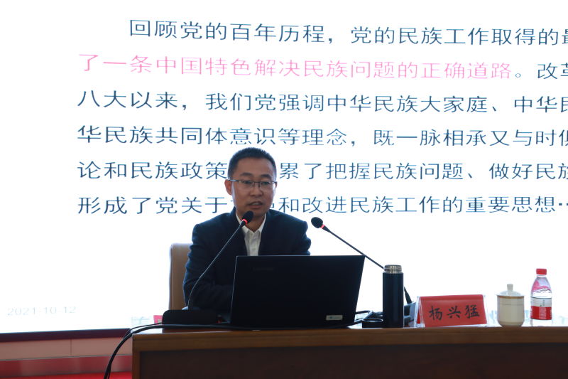 报告会上,杨兴猛教授以《学习贯彻中央民族工作会议精神 进一步铸牢中华民族共同体意识》为题,从“党关于加强和改进民族工作的重要思想”“铸牢中华民族共同体意识的深刻内涵和重大意义”“铸牢中华民族共同体意识的‘四大关系’和‘五项任务’”“切实加强党对民族工作的全面领导”四个方面作了系统深入的宣讲。
