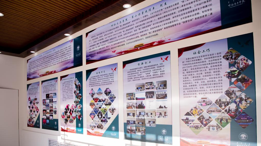 校园文创展示中心分为校园文创展区、师生作品展区和第二课堂教育体验中心三个部分。学校文创产品包含6个系列、50类、70余款,校园文创展区展出的文化衫、帆布包、手机壳、笔记本等融入呼院元素的文创产品,让呼院的精神与文化传递至每个人的学习与生活中。师生作品展区展示了教育学院、美术学院、农林学院、生命科学学院等师生的作品以及众合广告传媒有限公司的42款作品。第二课堂教育体验中心以宣传推广和帮助学生了解第二课堂为出发点,集参观性、学习性为一体。