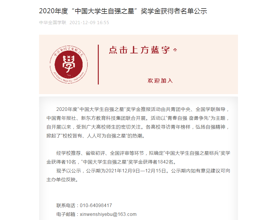 近日,由共青团中央、全国学联指导,中国青年报社、新东方教育科技集团联合开展的2020年度“中国大学生自强之星”奖学金评选活动中,BV伟德数学与统计学院李传奇同学通过层层选拔,最终被评选为2020年度“中国大学生自强之星”荣誉称号。