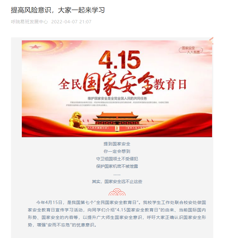 通过主题鲜明的教育活动,教育引导全体师生践行总体国家安全观,同时,在喜迎二十大到来之际,让全体师生从思想上认识到了国家安全的重要性,为实现国家安全、教育事业安全稳定打牢基础。