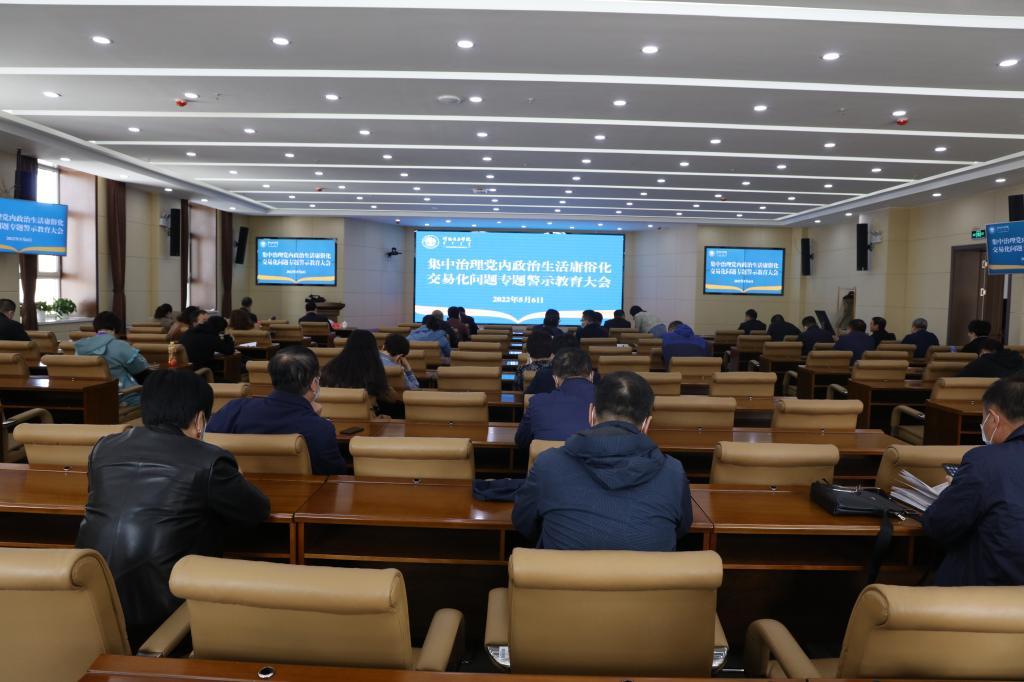 为进一步推进集中治理党内政治生活庸俗化交易化问题工作,营造风清气正的政治环境,近日,校党委召开集中治理党内政治生活庸俗化交易化问题警示教育大会,校领导班子成员及全校处级干部参加大会。
