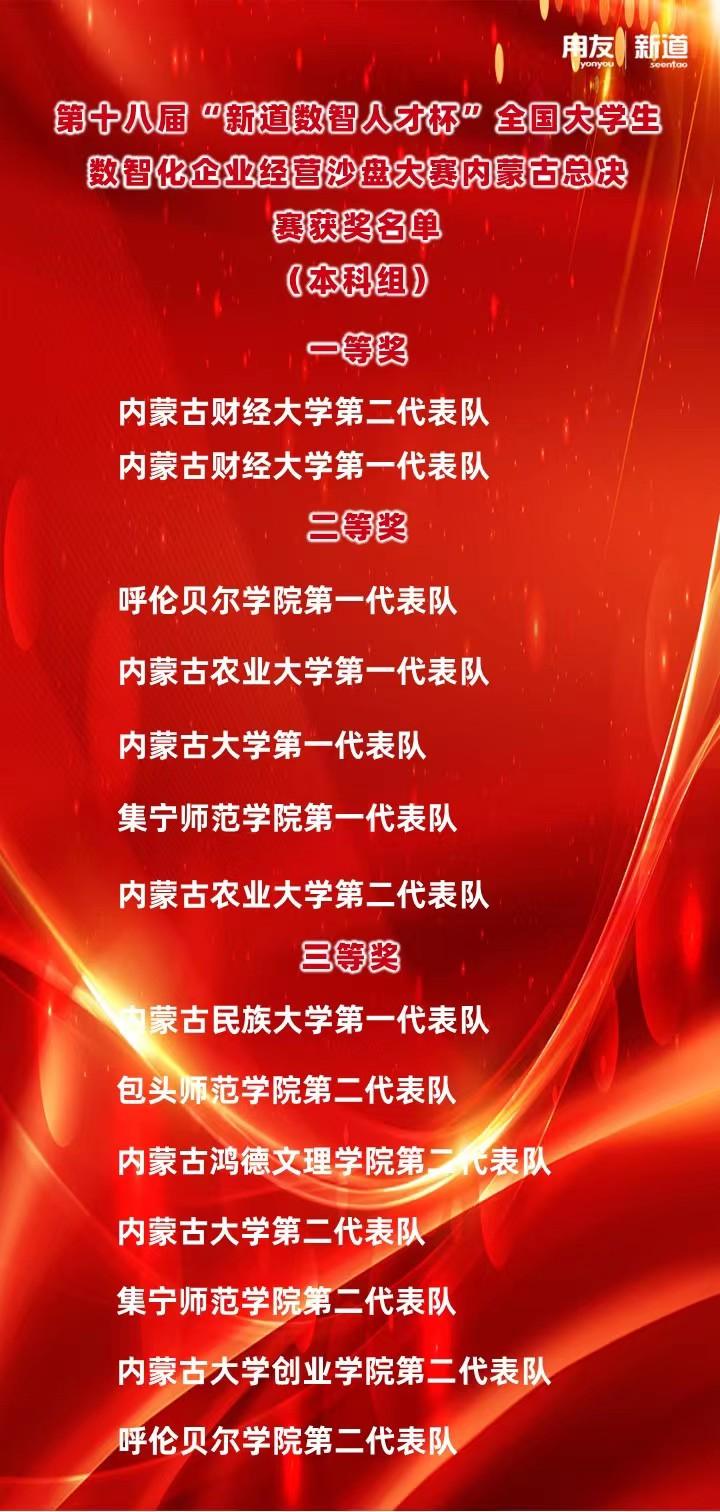 内蒙古自治区大学生数智化企业经营沙盘由中国商业联合会举办,内蒙古财经大学和内蒙古机电职业技术学院承办,新道科技股份有限公司作为技术支持。