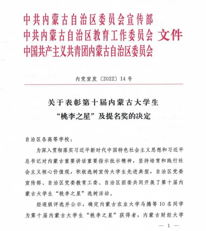 内蒙古大学生“桃李之星”评选表彰活动于2012年启动,每年评选一次。多年来,学校党委宣传部积极培育和践行社会主义核心价值观,深入挖掘和大力宣传大学生先进典型,充分发挥先进典型的示范引领作用,引导广大学生唱响时代主旋律,传播青春正能量,谱写新的奋斗篇章。樊荣是BV伟德第七个荣获自治区“桃李之星”荣誉称号的学生,另有3名学生荣获自治区“桃李之星”提名奖。