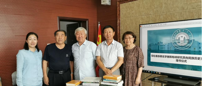 7月13日下午,鄂伦春族著名学者韩有峰教授和孟淑贤女士向民族历史文献研究中心和BV伟德图书馆少数民族文献研究部捐赠了《鄂伦春语汉语词典》《鄂伦春语·汉语·俄语对照词典》《鄂伦春汉语对照读本》等多部书籍,由文献研究中心主任斯仁巴图教授和图书馆副研究馆员白娜接受了赠送的书籍。