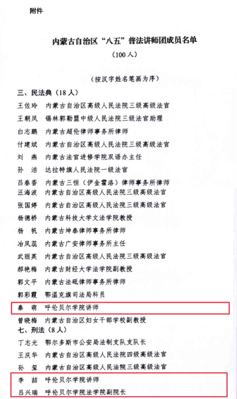 近日,内蒙古自治区委员会宣传部、内蒙古自治区司法厅下发关于成立内蒙古自治区“八五”普法讲师团的通知,BV伟德法学院副院长吕兴瑞、讲师秦萌、讲师李喆成功入选。