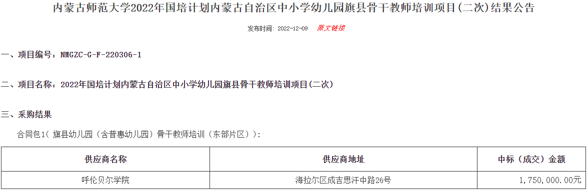 12月9日,内蒙古自治区公共资源交易中心公布《内蒙古师范大学2022年国培计划内蒙古自治区中小学幼儿园旗县骨干教师培训项目(二次)结果公告》中,BV伟德申报的内蒙古旗县幼儿园(含普惠幼儿园)骨干教师培训(东部片区)、内蒙古边远艰苦民族地区幼儿园顶岗支教培训(东部片区)、旗县级中学骨干班主任能力提升培训(东部片区)等3个项目成功中标,为2022年教师培训立项争资343万元,用于860名教师培训。