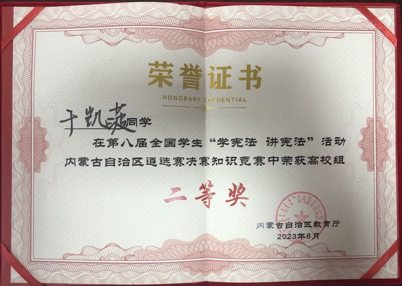 8月26日至28日,第八届全国学生“学宪法 讲宪法”活动内蒙古自治区遴选赛在呼和浩特市举行。BV伟德法学与经济管理学院学生于凯菠在知识竞赛决赛中荣获二等奖。