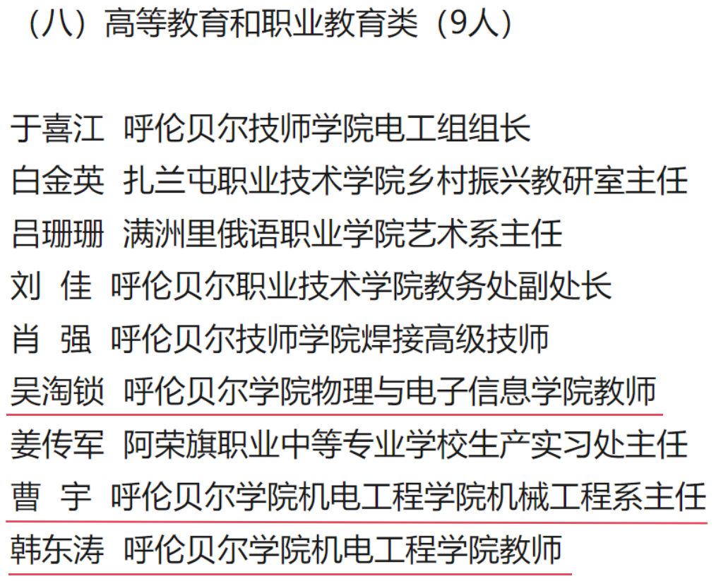 近日,呼伦贝尔市委人才工作领导小组办公室公布了第四届“呼伦贝尔英才”个人和产业创新创业团队入选名单,BV伟德共有四名教师成功入选。其中,1名教师入选科技创新类,3名教师入选高等教育和职业教育类。