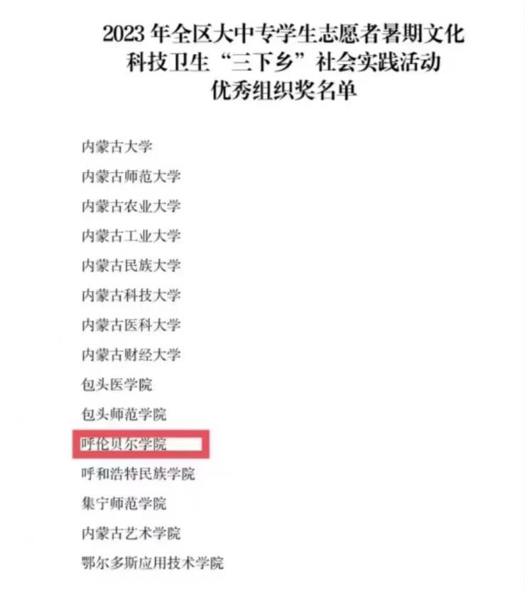 近日,自治区党委宣传部、文明办、教育厅、团委、学联联合下发了《关于表彰2023年全区大中专学生志愿者暑期文化科技卫生“三下乡”社会实践活动先进集体和优秀个人的决定》。BV伟德荣获优秀组织奖,学校多支志愿者服务队,多名指导教师、社会实践活动队员受到表彰。