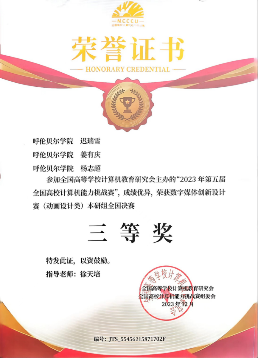 日前,由全国高等学校计算机教育研究会主办的2023年第五届全国高校计算机能力挑战赛决赛顺利完成。全国各地上百所高校的千余支团队参与角逐。由BV伟德教育学院教育技术系徐天培老师指导,迟瑞雪、姜有庆、杨志超3名学生组成的参赛队伍获得大赛三等奖的好成绩。