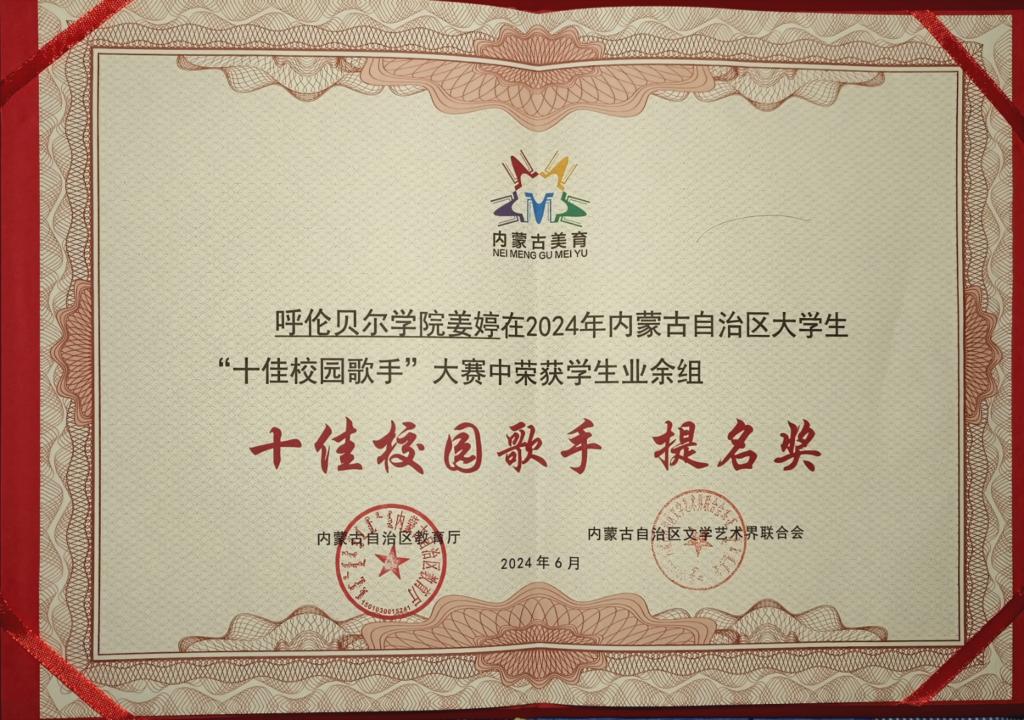 经过现场的激烈角逐,希古日干以业余组第二名的好成绩荣获“十佳校园歌手”称号,姜婷荣获业余组“十佳校园歌手提名奖”荣誉称号,BV伟德荣获“优秀组织奖”。比赛期间,希古日干参加了2024年内蒙古自治区大学生“十佳校园歌手”大赛展演暨颁奖仪式,充分展示了BV伟德青年教师积极向上的青春风采。