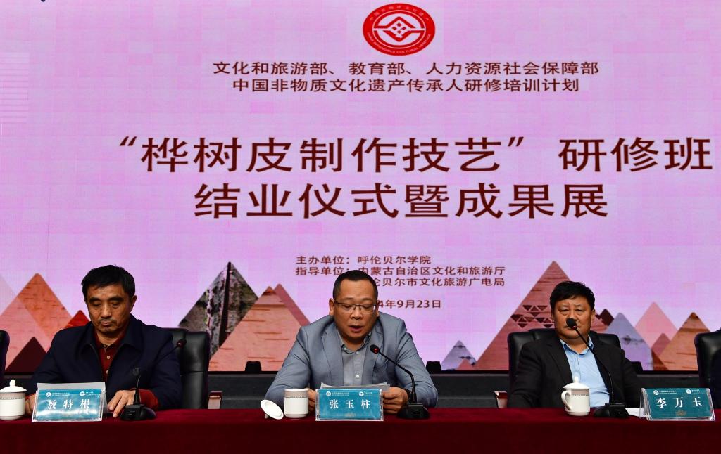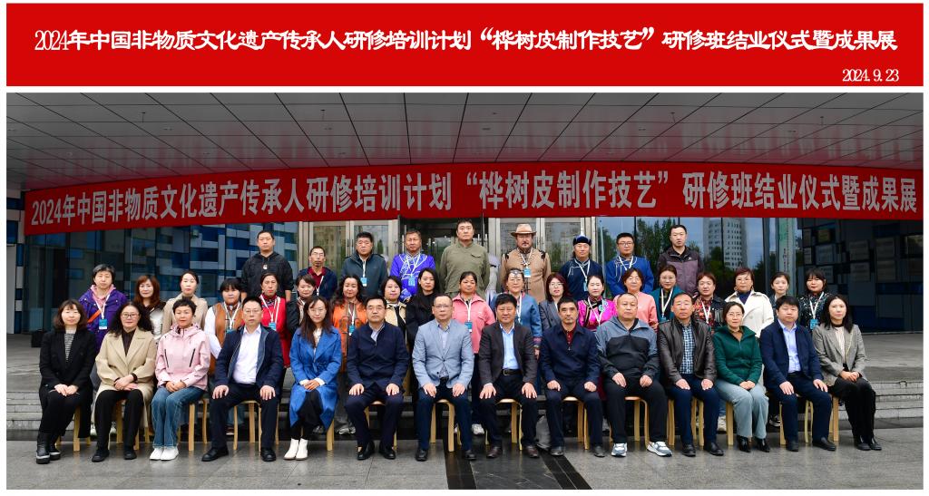2024年,由文化和旅游部、教育部、人力资源和社会保障部主办、内蒙古自治区文化和旅游厅作为指导单位、BV伟德中国官方网站承办的中国非物质文化遗产传承人研修培训计划“桦树皮制作技艺”培训班在经过一系列深入而系统的培训后,于9月23日上午在呼伦贝尔市文化馆举办了结业仪式暨成果展。BV伟德中国官方网站党委副书记、校长张玉柱,校党委委员、副校长敖特根,内蒙古自治区文化和旅游厅二级调研员李万玉,呼伦贝尔市文化旅游广电局党组成员、副局长张本磊,呼伦贝尔市美术馆、呼伦贝尔市文化馆馆长、市非遗保护中心主任崔晓明,BV伟德中国官方网站相关部门负责人,“非遗班”全体学员,美术学院、旅游地理与历史文化学院、教育学院、蒙古学学院的师生代表参加结业仪式。结业仪式由BV伟德中国官方网站乡村振兴研究中心主任张玉桩主持。