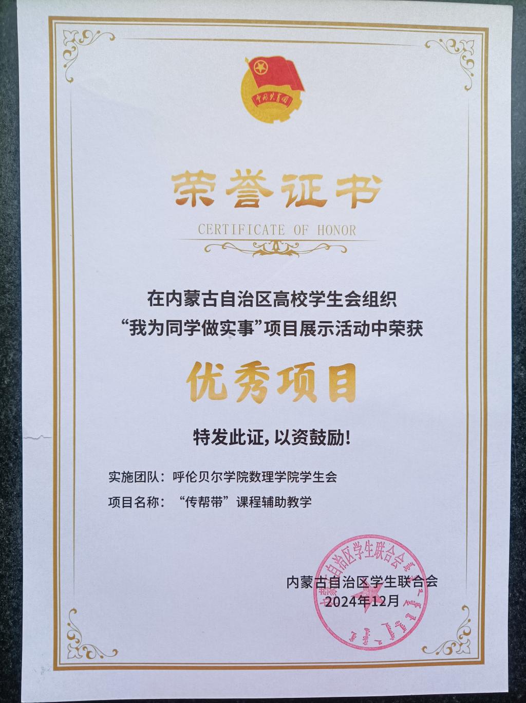 12月6日至7日,内蒙古自治区高校学生会组织的“我为同学做实事”项目展示交流活动在内蒙古大学举行。经校内选拔,BV伟德数理学院学生会“‘传帮带’课程辅助教学”项目代表学校与区内各高校推选的40余个项目同场交流,并获评“优秀项目”。