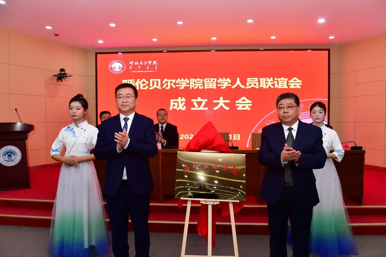 马跃东和李文阁共同为留学人员联谊会揭牌。