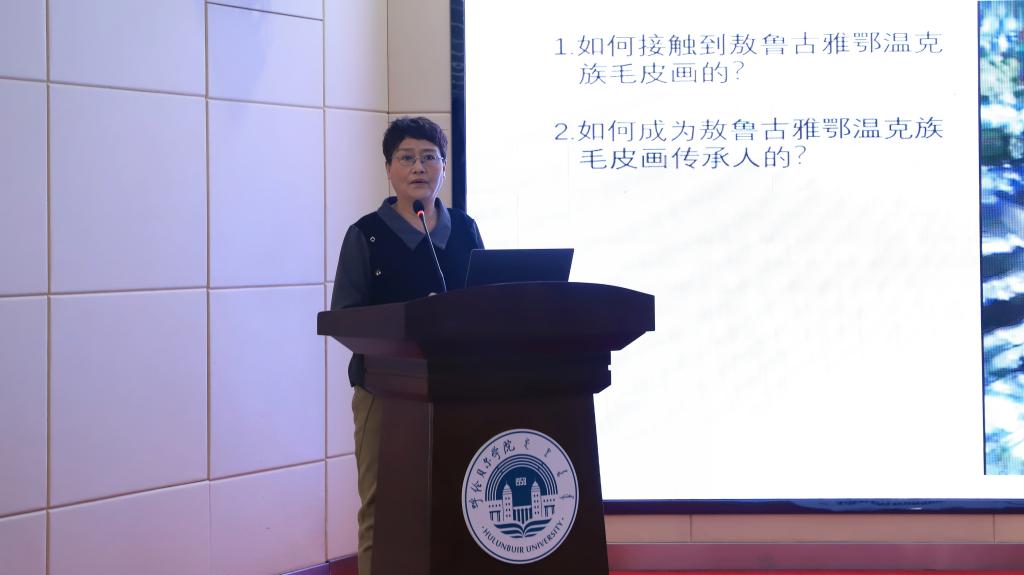 根河市敖鲁古雅鄂温克族毛皮画制作技艺非遗传承人宋仕华以《坚守与传承——我与敖鲁古雅鄂温克族毛皮画的故事》为题,为在场师生讲述作为非遗传承人的坚守,她以匠心守护传统技艺,在弘扬北疆文化的进程中,用实际行动践行非物质文化遗产的保护与传承。