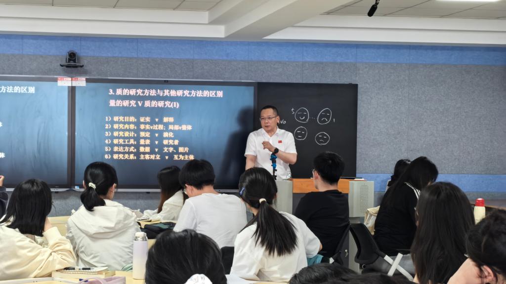 讲座中,张玉柱围绕质性研究的核心内容展开系统讲解。他首先清晰阐释了质性研究的定义与特点,剖析其与量化研究的本质区别;随后结合学术前沿案例,解读质性研究的理论基础,梳理质性研究的范围及步骤、重要环节,帮助师生明确该研究方法在心理学、教育学等领域的适用场景。张玉柱结合自身博士论文写作经历,以深入浅出的方式将抽象的研究方法转化为可感知、可操作的实践流程,让在场师生对质性研究的实际应用有了更直观的认识。
