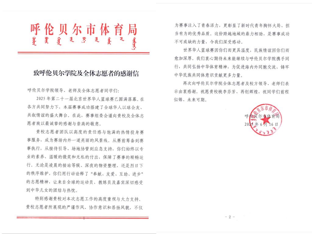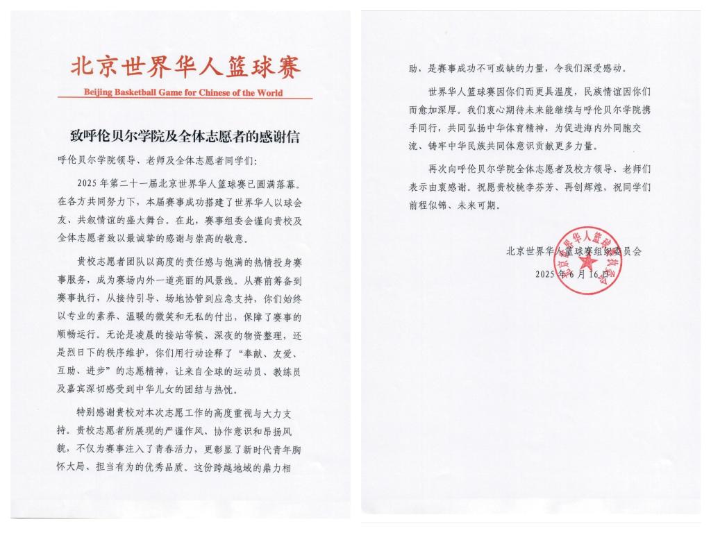 6月15日,2025年第21届北京世界华人篮球赛在呼伦贝尔市落下帷幕。BV伟德100名学生志愿者、4名带队教师践行“团结、友爱、互助、进步”的志愿精神,以高度的责任感、细致周到的志愿服务态度、专业的志愿服务能力圆满完成赛事服务,成为赛场内外一道亮丽的风景线。