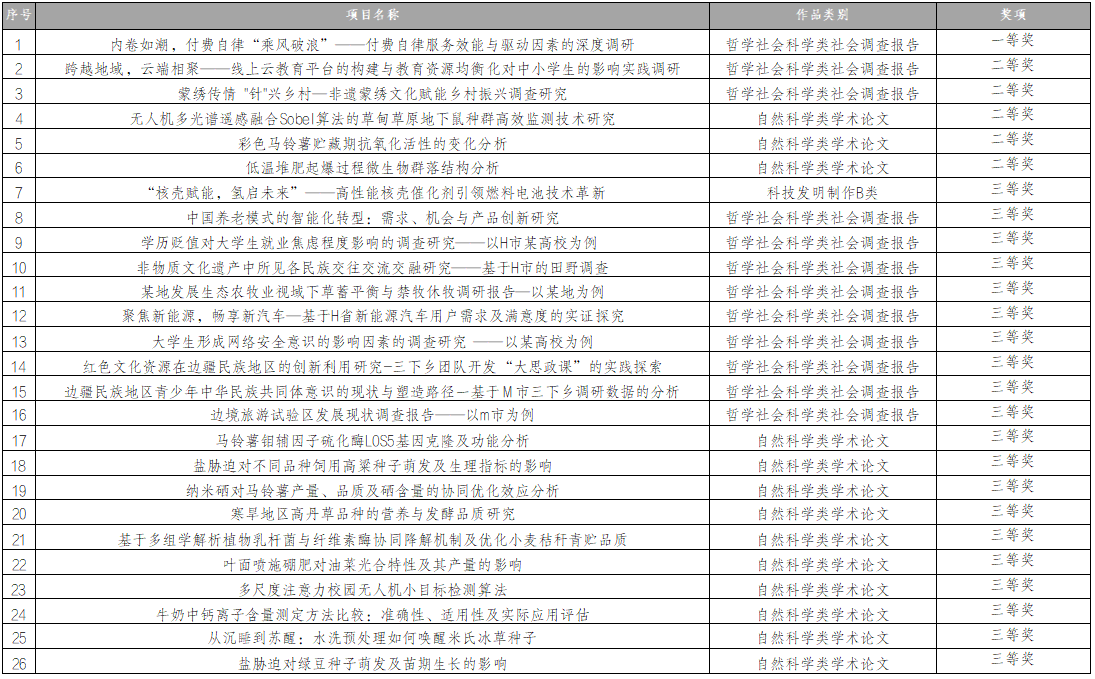 本届“挑战杯”竞赛秉承“崇尚科学、追求真知、勤奋学习、锐意创新、迎接挑战”的宗旨,分为自然科学类学术论文、科技发明制作、哲学社会科学类社会调查报告三个赛道。自大赛启动以来,校团委在师生中多渠道进行宣传,深入挖掘项目、进行重点培育,邀请校内外专家进行赛前培训,为师生提供全方位的备赛指导,建构了完善的“挑战杯”参赛服务体系,持续扩大比赛影响力。比赛共征集作品392件,各项目团队深耕细作,以严谨的态度打磨方案,30项作品推报进入自治区赛,6项作品跻身自治区终审决赛。最终,《内卷如潮,付费自律“乘风破浪”——付费自律服务效能与驱动因素的深度调研》项目荣获全区一等奖,《跨越地域,云端相聚——线上云教育平台的构建与教育资源均衡化对中小学生的影响实践调研》《无人机多光谱遥感融合Sobel算法的草甸草原地下鼠种群高效监测技术研究》等5个项目荣获全区二等奖,《中国养老模式的智能化转型:需求、机会与产品创新研究》《马铃薯钼辅因子硫化酶LOS5基因克隆及功能分析》等20个项目荣获全区三等奖。