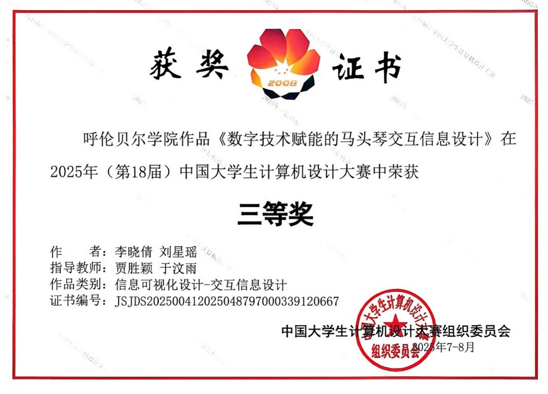 此次赛事中,BV伟德学子的优异表现离不开师生团队的协同攻坚。自赛事启动以来,由张颖、孙宇琴、刘翔宇等同学组成的参赛团队,在指导教师的全程悉心指导下,投入大量时间与精力打磨作品。从最初的选题构思到后续的方案完善,师生们反复推敲作品的框架与细节;为了达到最佳呈现效果,团队成员对每一个技术环节、每一段演示内容都精益求精,历经数轮修改优化。最终,凭借这份执着与努力,作品《解构天章—中国古代天文学大数据视觉图谱》《数字技术赋能的马头琴交互信息设计》分别荣获信息可视化设计类二等奖、三等奖。