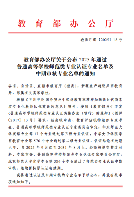 近日,教育部办公厅正式发布了《教育部办公厅关于公布2025年通过普通高等学校师范类专业认证专业名单及中期审核专业名单的通知》(教师厅函[2025]18号)。在此次认证中,BV伟德美术学、思想政治教育、英语、体育教育专业成功通过第二级专业认证。数学与应用数学专业通过师范类专业认证第二级认证中期审核。