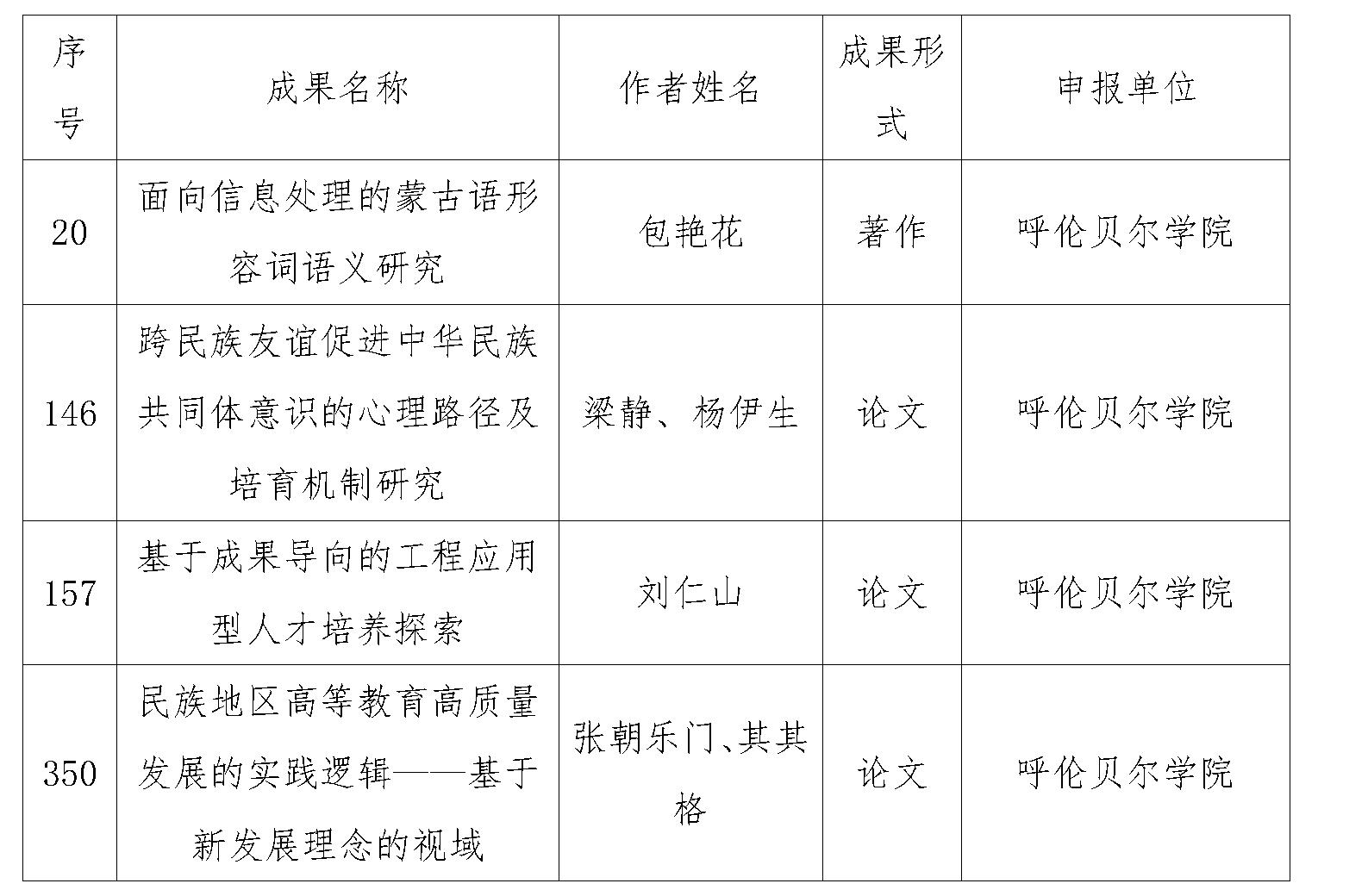 第十一届内蒙古自治区哲学社会科学奖复评公示结束,BV伟德包艳花教授申报的著作《面向信息处理的蒙古语形容词语义研究》、刘仁山教授申报的论文《基于成果导向的工程应用型人才培养探索》、梁静副教授申报的论文《跨民族友谊促进中华民族共同体意识的心理路径及培育机制研究》、张朝乐门副教授申报的论文《民族地区高等教育高质量发展的实践逻辑——基于新发展理念的视域》经自治区资格复审、复评,入围第十一届内蒙古自治区哲学社会科学优秀成果奖。