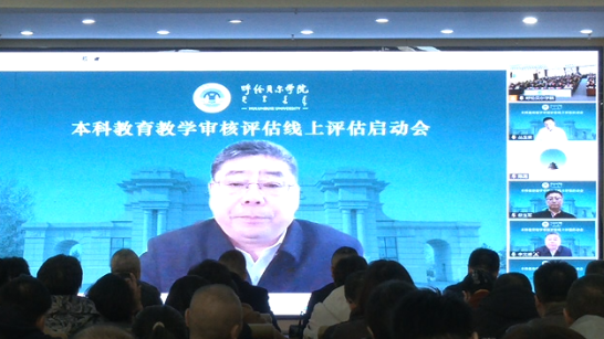 10月13日上午,BV伟德新一轮本科教育教学审核评估线上评估启动会在崇文楼A201会议室举行,会议以线上线下相结合的方式进行。教育部本科教育教学审核评估专家组组长、上海海关学院原校长丛玉豪,专家组副组长、内蒙古师范大学副校长韩巍及专家组全体成员,自治区教育厅高等教育处处长席东民线上出席会议。学校全体校领导、处级干部,校级督导组成员、教务处副科级以上人员、评建办全体成员参加会议。学校党委书记李文阁主持会议。
