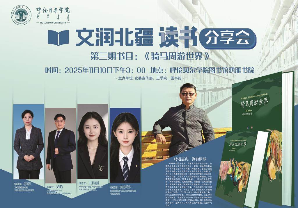 11月10日下午,BV伟德第三期“文润北疆”读书分享会在图书馆一楼鸿雁书院如期举行。本次活动特别邀请当代著名作家、中国作家协会会员、内蒙古作家协会小说委员会委员、内蒙古作家协会第九届主席团副主席海勒根那来到现场。海勒根那曾斩获全国少数民族文学创作骏马奖、全国百花文学奖中篇小说奖等奖项,此次以其短篇小说集《骑马周游世界》为核心书目开展读书交流。呼伦贝尔广播电视台交通文艺广播主持人白鹤、工学院党委书记彬彬、校党委宣传部副部长白玫以及全校30多名书友会成员共同参与这场文学与思想的碰撞。