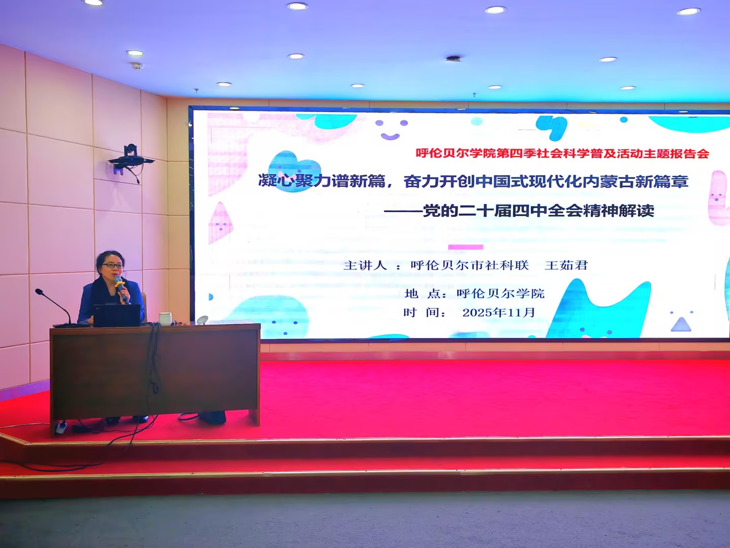 为深入学习贯彻党的二十届四中全会精神,推动社会科学知识普及与理论武装深度融合,11月25日上午,BV伟德在崇文楼A501会议室举行了第四季社会科学普及活动主题报告会。呼伦贝尔市社科联副主席王茹君以“凝心聚力谱新篇,奋力开创中国式现代化内蒙古新篇章”为主题作专题报告,来自各部门和BV伟德中国官方网站社会科学普及基地的120余名干部及教师代表集中聆听了主题报告。