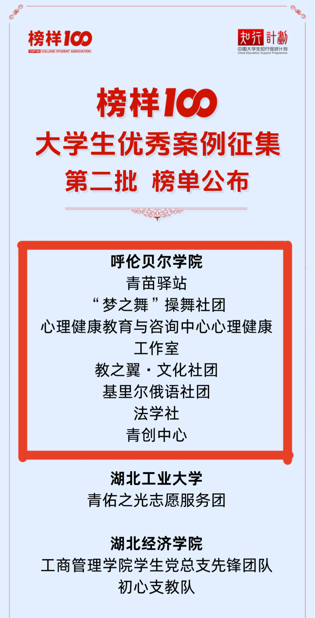 “榜样100”全国优秀大学生社团及团队征集活动是国内具有较高影响力的大学生社团评选活动之一,旨在挖掘和表彰在思想引领、学术科研、文化传承、志愿服务、创新创业等领域表现突出的大学生社团,搭建高校社团交流展示的平台,激发青年学生的主动性和创造性。