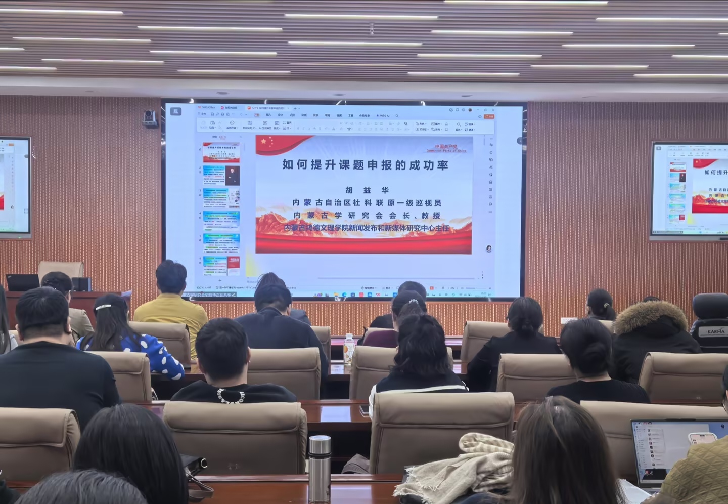 为深入推进组织化科研工作,助力科研人员精准把握国家社科基金项目及社科类课题申报要点,提升申报质量与成功率,促进全校科研工作高质量发展,12月19日下午,科学技术处在崇文楼A501会议室举办专题辅导讲座。本次讲座采取“线下集中+线上授课”相结合的方式,特邀内蒙古自治区社科联原副主席、一级巡视员胡益华教授主讲,各二级学院及科研机构科研骨干齐聚现场聆听学习。