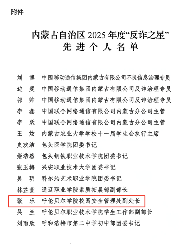 近日,共青团内蒙古自治区委员会、自治区通信管理局、中国人民银行内蒙古自治区分行联合发布《关于对内蒙古自治区2025年度“反诈之星”先进典型予以表扬的通报》,BV伟德校园安全管理处副处长张乐入选获评2025年度“反诈之星”。