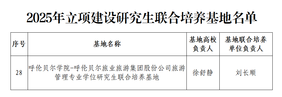 近日,自治区教育厅下发《关于公布2025年立项建设研究生联合培养基地名单及成效评价结果的通知》(内教研函〔2025〕38号),BV伟德与呼伦贝尔旅业旅游集团股份公司共建的旅游管理硕士专业学位研究生联合培养基地获批自治区研究生联合培养基地。