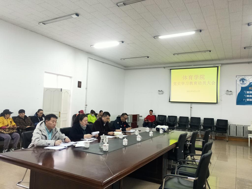 为深入学习贯彻习近平总书记在党史学习教育动员大会上的重要讲话精神,3月17日,体育学院党总支召开党史学习教育动员大会。全体教职工参会。