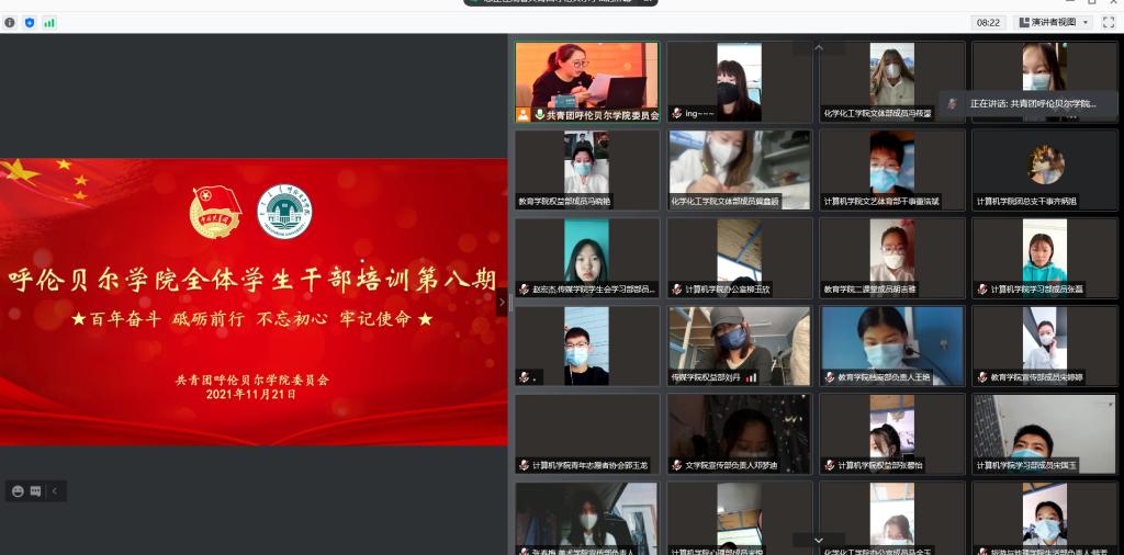 11月21日上午,校团委组织召开全体学生会干部第八期培训会,主讲人为校团委副书记格根塔娜。培训会通过线上、线下相结合的方式进行。线下由校学生会全体成员及各二级学院学生会主席团成员70人参加,二级学院全体学生会干部通过腾讯会议在线上参加,共计300余人。