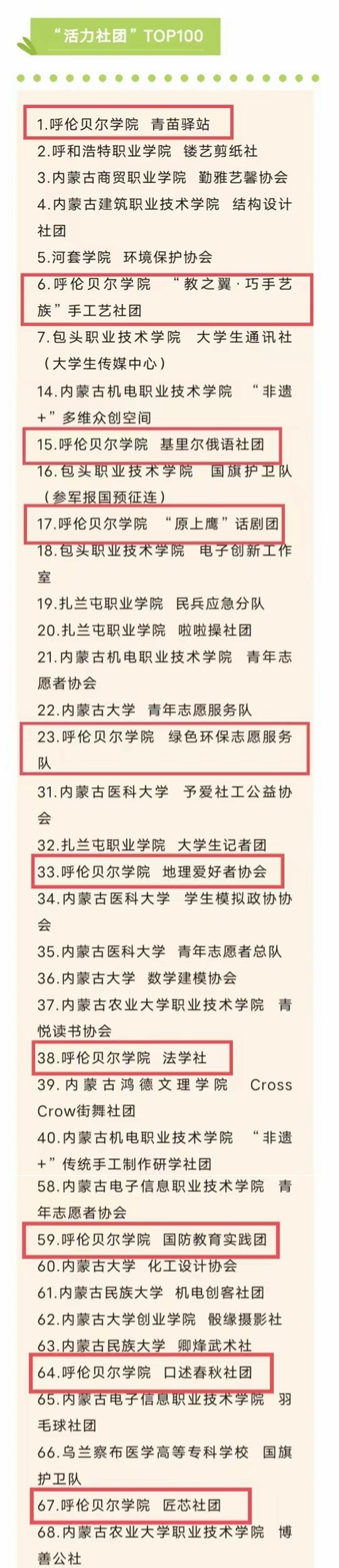 BV伟德十个学生社团入选2023-2024学年内蒙古自治区高校“活力社团”TOP100榜