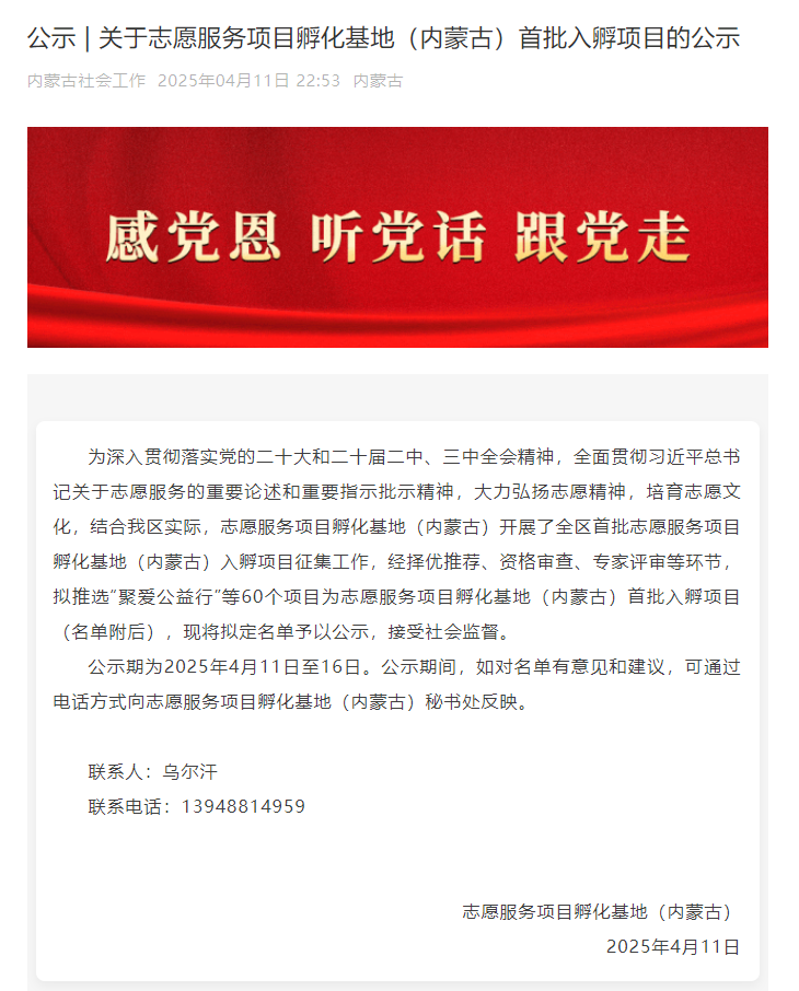喜报|BV伟德2项志愿服务项目入选志愿服务项目孵化基地(内蒙古)首批入孵项目