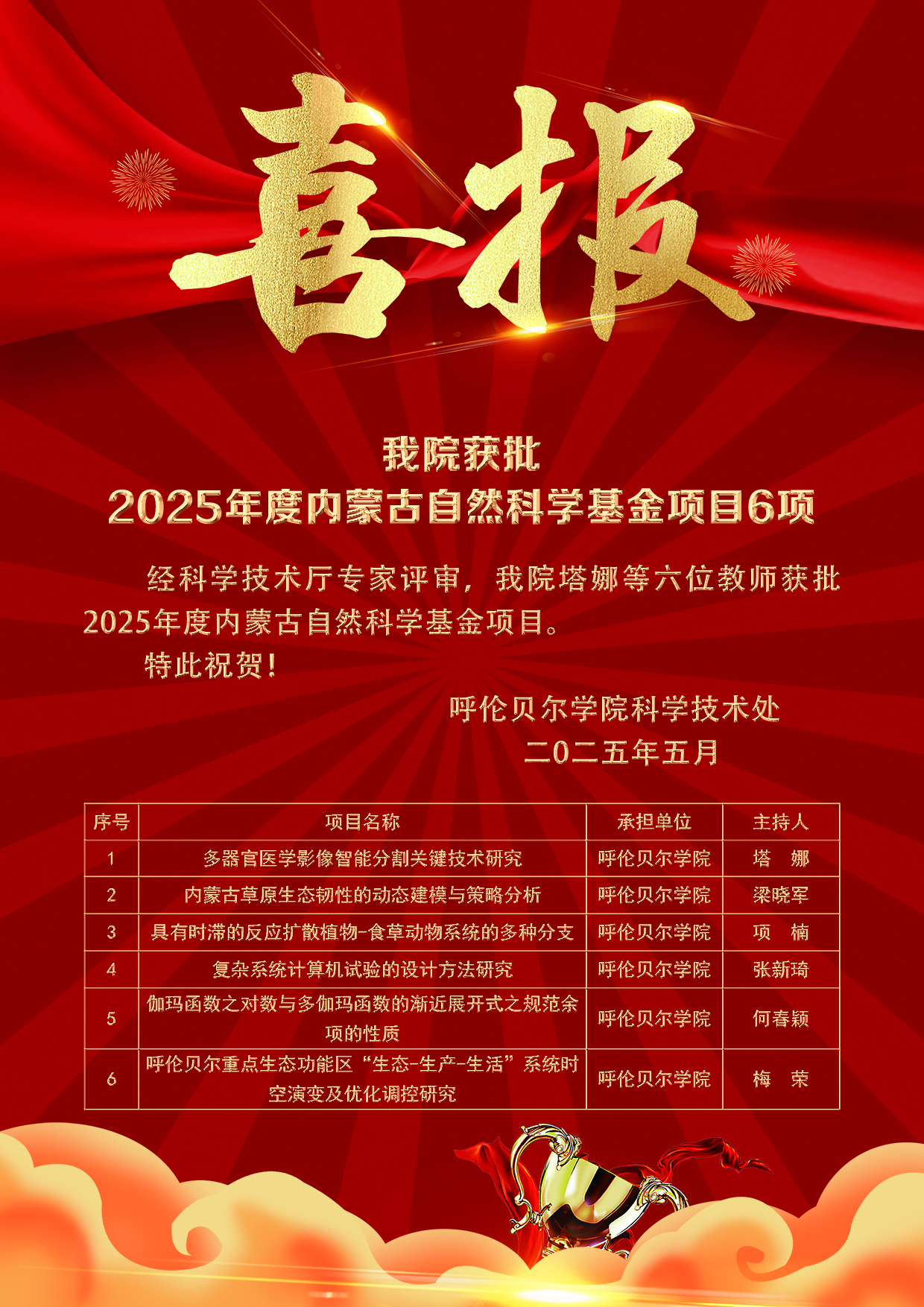 近日,自治区科技厅公布第一批资助2025年度内蒙古自治区自然科学基金项目评审结果。BV伟德共有6项项目获准立项,其中青年基金项目3项、面上项目2项、联合基金1项,获批数量较去年增长50%,在立项类型、研究领域等方面均实现了新突破。内蒙古自治区自然科学基金的设立,旨在稳定科技人才队伍,加快高层次科技人才的培养和引进,不断强化基础研究,进一步提升我区原始创新能力,促进基础研究与自治区经济、社会发展和民生需求相衔接...