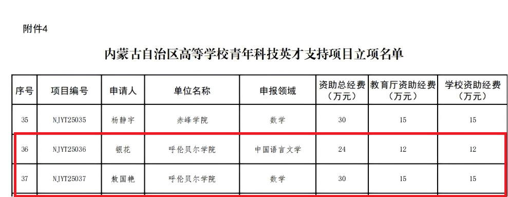 近日,2025年内蒙古自治区“高等学校青年科技人才发展项目”及首批“五大任务”关键技术研究专项评选结果正式揭晓,BV伟德教师银花副教授和敖国艳副教授成功入选内蒙古高等学校青年科技英才。“青年科技英才支持项目”旨在引导和支持自治区高等学校优秀青年科技人才围绕国家和自治区重大科技问题、哲学社会科学问题、学术前沿问题进行创新研究,培养造就一大批青年拔尖创新人才,持续提升高校自主创新能力和人才培养质量。学校近...