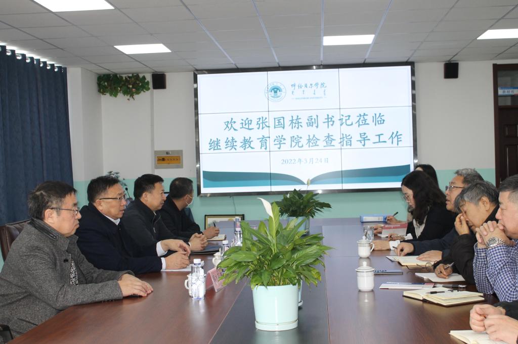 3月24日上午,校党委委员、副书记张国栋到继续教育学院调研指导工作。党委统战部部长张树福、后勤管理处处长那木斯来、校园安全管理处处长毛永强陪同。调研会上,继续教育学院直属党支部书记何平就校园安全、疫情防控、国家通用语言文字等三个方面做了汇报。院长莎茹莉汇报了继续教育学院近一时期各项培训业务进展情况及市培、省培、国培等服务地方基础教育项目的拓展情况、2022年工作重点、亮点。张国栋副书记听取汇报后对继续...