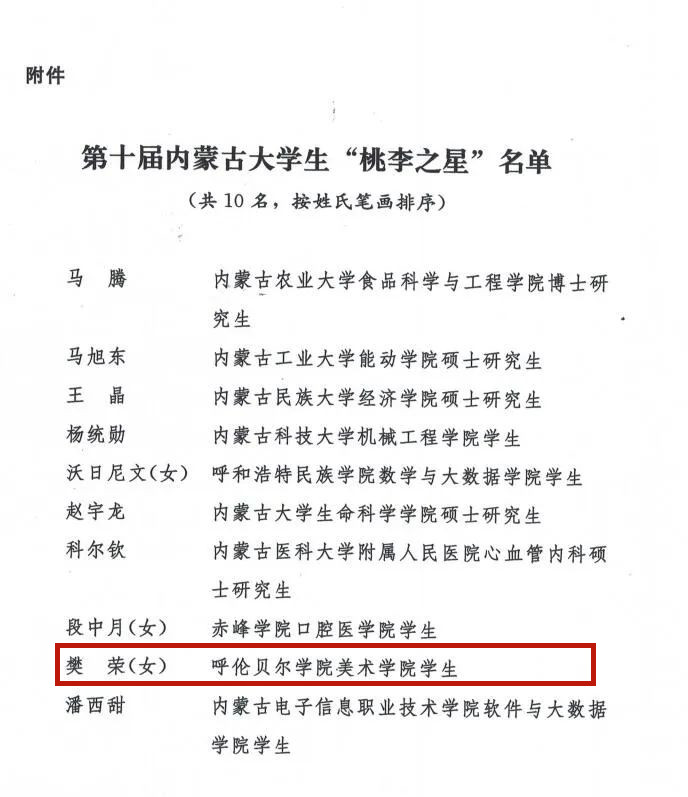 近日,内蒙古自治区党委宣传部、党委教育工委、团委印发《关于表彰第十届内蒙古大学生“桃李之星”及提名奖的决定》(内党宣发【2022】14号),BV伟德美术学院2018级美术学国画班学生樊荣荣获第十届内蒙古大学生“桃李之星”称号。樊荣,女,中共党员,汉族,她综合测评成绩始终名列全院第一,积极参与各种公益活动,是内蒙古自治区巴彦淖尔市社区美术教育支教团队创始人、内蒙古自治区巴彦淖尔市临河区西环街道泰城社区共青团团...
